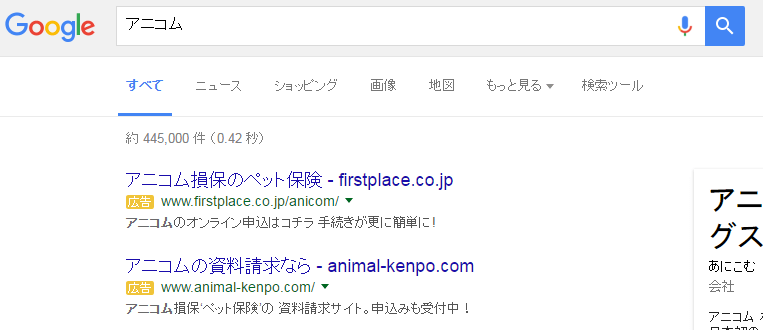 例えば、ペット保険の最大手である『アニコム』をGoogle検索にかけると、下記のような2つの異なる広告が出てきます。